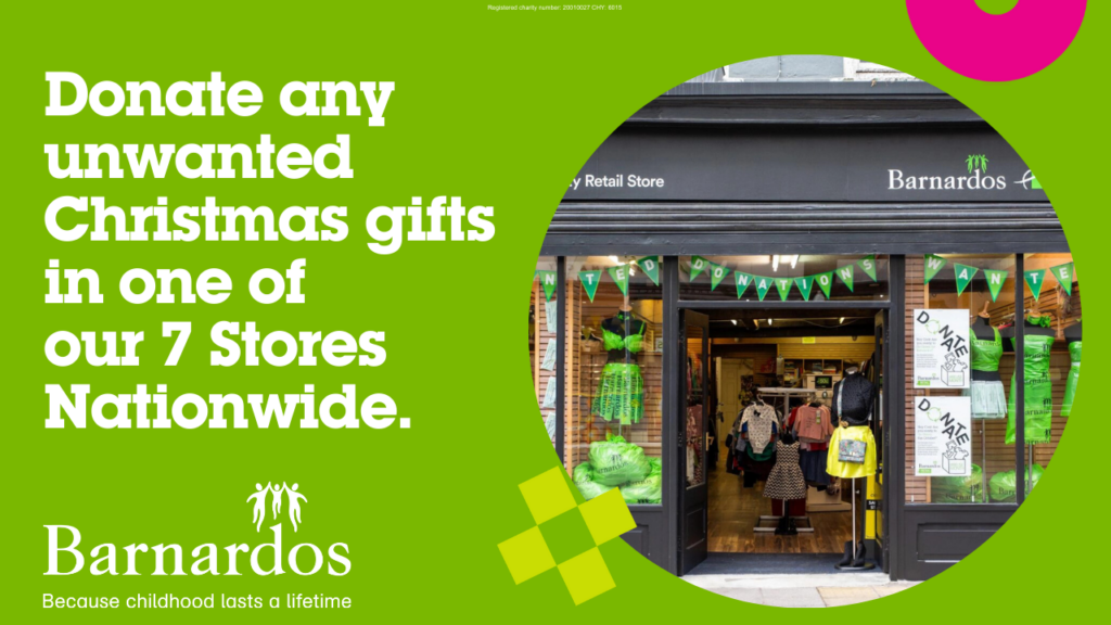 “We all know the feeling of receiving Christmas presents that we don’t really want or need and end up stuck with them lying around the house. Instead of leaving them clogging our cupboards, take them down to your local Barnardos shop where we will happily find someone to put them to good use. The funds raised from these donations go directly towards our work in 56 service locations, where we help children when they need it most. Because childhood lasts a lifetime.”