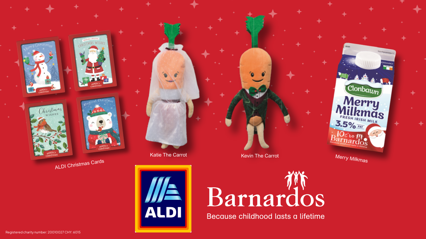 ALDI will have a range of in store products for sale this Christmas with proceeds supporting Barnardos’ work nationwide. Keep your eyes peeled for the greeting cards, Kevin and Katie on their big day and of course some Merry Milkmas!